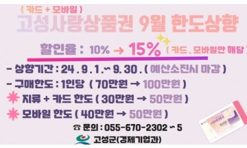 다가오는 명절을 맞이하여 합리적 소비를 원한다면, 고성사랑상품권 구매 고객에게는 9월이 적기이다.고성군(군수 이상근)이 지역경제 활성화를 위해 고성사랑상품권(이하 ‘상품권)으로 시행하는 정책은 크게 두 가지다.첫째는 9월 한 달간 한시적으로 모바일(제로페이)·카드형 상품권에 대해 기존 10%에서 15% 선할인을 실시하고, 개인 월 구매 한도를 70만 원에서 100만 원으로 확대하는 것이다.둘째는 9월부터 12월까지 모바일(제로페이)상품권으로 △청년(만18세~45세)소상공인 가맹점 △전통시장내 가맹점 △착한가격업소 △공룡나라쇼핑몰에서 결제 시 5% 캐시백을 지급한다는 것이다.이번 15% 특별할인은 추석명절을 맞아 내수 활성화를