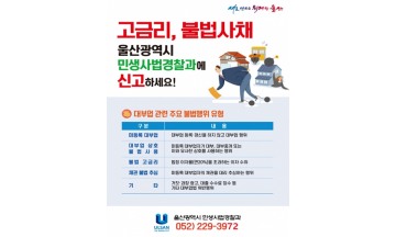 울산시는 8월 26일부터 9월 13일까지 추석 대비 불법 대부 영업 특별 단속을 실시한다고 밝혔다.  이번 특별 단속은 추석 연휴를 앞두고 사업과 생활자금 수요가 늘어나는 자영업자, 소상공인 등 경제적 취약 시민들의 불법 대부 피해 예방을 위해 마련됐다.  단속 대상은 대부업 126개소, 대부중개업 47개소 등 등록 업체 173개소와 불법 사채업이다.  주요 단속 내용은 ▲법정 이자율(연 20%) 초과 징수 여부 ▲무등록 대부 행위 및 유사상호 사용 광고 행위 ▲허위 과장 광고 및 대부 이용자에게 부당 수수료 징수 여부 등이다.  울산시는 단속결과 위반업체에 대해서는 형사처분 및 영업정지 등의 행정 조치할 예정이다.  또한, 이 기간 주요