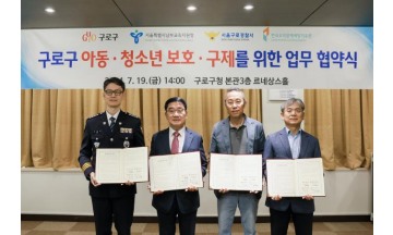 구로구가 서울남부교육지원청, 구로경찰서, 한국도박문제예방치유원과 함께 아동‧청소년을 유해환경으로부터 보호하기 위한 업무협약을 7월 19일 구청 르네상스홀에서 체결했다.이날 협약식은 문헌일 구로구청장, 이문수 서울남부교육지원청 교육장, 박재석 구로경찰서장, 김진엽 한국도박문제예방치유원 협력지원본부장이 참석한 가운데 진행됐다.구는 이번 협약을 통해 아동이 안전한 환경에서 자랄 수 있도록 ‘아동보호구역’을 지정하고, 위기청소년들을 청소년상담복지센터, 학교밖청소년지원센터, 청소년복지시설 등 청소년시설에 연계할 수 있는 협력체계를 구축하기로 했다.청소년 안전망 통합 지원체계 운영과 아동‧청소년 유해환경에