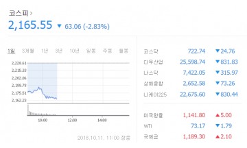 코스피가 11일 미국발 악재에 휘청이며 2%대의 하락세로 출발, 단숨에 2,160대까지 내려앉았다. 이날 오전 11시 코스피는 전날보다 63.06포인트(2.83%) 내린 2,165.55으로 2,160대에서 약세를 이어가고 있다. 간밤 뉴욕증시에서는 미국 국채금리 상승 부담과 기술주 불안 우려가 겹치며 다우존스 30 산업평균지수(-3.15%), 스탠더드앤드푸어스(S&P) 500 지수(-3.29%), 나스닥 지수(-4.08%) 등 주요 지수가 일제히 급락했다. 이런 영향으로 유가증권시장에서 외국인이 2,190억원 어치를 순매도했다. 개인과 기관은 각각 300억원, 1,890억원을 순매수 중이다. 같은 시간 코스닥지수는 전 거래일보다 24.56포인트(3.29%) 내린 722.9