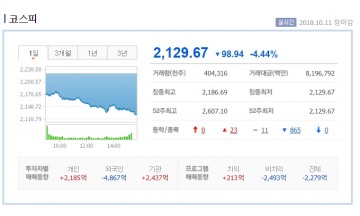 코스피가 미국발 쇼크로 인한 외국인의 매도에 2130선 밑으로 떨어졌다. 11일 코스피는 전거래일 대비 98.94포인트(4.44%) 내린 2129.67포인트에 마감됐다. 이날 코스피는 전거래일 대비 52.45포인트(2.35%) 내린 2176.16으로 개장했다. 이는 외국인이 4867억원을 순매도한 영향이다. 개인 2185억원, 기관 2437억원을 순매수했지만 역부족이였다. 규모별로 대형주(-4.34%), 중형주(-4.83%), 소형주(-5.04%) 모두 하락세다. 업종별로 화학(-4.77%), 종이 및 목재(-5.94%) 등이다. 시가총액 상위종목별로 삼성전자(-4.86%), SK하이닉스(-1.85%), 셀트리온(-5.24%) 등이다. 코스닥은 전거래일 대비 40.12포인트(5.37%) 내린