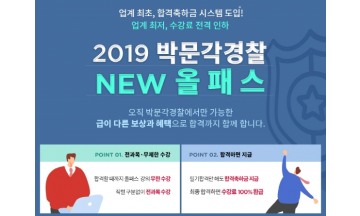 수험 교육 전문기업 박문각 경찰은 2019년 경찰 시험 대비, 신규 강사 영입과 환급 혜택 등으로 더욱 강력해진 ‘경찰 전 과목 NEW 올패스’ 상품을 지난달 20일 출시하고 기념 이벤트를 진행한다고 밝혔다.박문각의 ‘경찰 전 과목 NEW 올패스’는 관리형 온라인 종합 강의 상품으로, 선택 과목들을 추가 비용 없이 무제한 수강할 수 있으며, 파격적인 합격 축하금 지급 시스템을 도입과 저렴한 수강료로 경찰 수험생들의 큰 호응이 이어지고 있다.특히, 필기만 합격해도 합격 축하금이 지급되는 ‘올패스’상품과 2019년 최종 합격 시 수강료 전액이 환급되며, 불합격 시에도 수강 기간을 무한으로 연장할 수 있는 ‘올패스 PLUS’ 상품 등으로