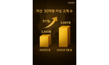 삼성증권이 30억원 이상 고객의 수가 업계 최초로 5000명을 돌파했다고 22일 밝혔다. 삼성증권이 분석한 자료에 따르면, 2025년 9월 말 기준 삼성증권의 자산 30억원 이상 고객 수는 5449명으로 2020년 말 대비 91% 증가했다. 연령대별 증가율은 30대(194%), 40대(184%), 20대(178%), 50대(147%), 60대(93%), 70대 이상(39%) 순이다. 젊은 세대의 신규 유입이 초부유층 고객 수의 성장을 주도한 것으로 나타났다. 삼성증권 고객의 자산 포트폴리오 내 현금 비중은 2020년 말 23.0% 수준에서 2025년 9월 말 11.5%로, 11.5%p 감소하며 투자 자산의 효율성을 극대화하는 추세가 확인됐다. 이들 고객의 자산 포트폴리오는 주로 글로벌 자산으로 리밸런