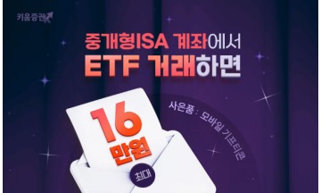 키움증권이 오는 12월 30일까지 '중개형ISA에서 ETF 거래하면 최대 16만원 혜택' 이벤트를 진행한다고 21일 밝혔다.해당 이벤트는 중개형 개인종합자산관리계좌(ISA)에서 상장지수펀드(ETF)를 거래한 고객을 대상으로 최대 16만원 상당의 모바일 기프티콘을 제공한다.이벤트는 키움투자자산운용(KIWOOM), 미래에셋자산운용(TIGER), 삼성자산운용(KODEX), 한국투자신탁운용(ACE), KB자산운용(RISE), 타임폴리오자산운용(TIMEFOLIO), 트러스톤자산운용(TRUSTON), 삼성액티브자산운용(KOACT) 8개 운용사의 ETF를 대상으로 한다. 고객의 순매수 금액에 따라 추첨을 통해 당첨자를 선정하며, 최대 16만원의 모바일 기프티콘을 경품으로 지급할 예정이다