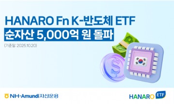 NH-Amundi자산운용은 HANARO Fn K-반도체 ETF의 순 자산 총액이 5000억원을 돌파했다고 24일 밝혔다.코스콤 ETF CHECK에 따르면 22일 기준 HANARO Fn K-반도체 ETF의 순자산은 5035억원으로 집계됐다. 9월 초 2459억원 수준이던 순자산은 두 달 만에 2배 이상 증가했다.HANARO Fn K-반도체는 한국을 대표하는 반도체 기업 20종목에 투자하는 ETF다. 해당 ETF의 삼성전자와 SK하이닉스의 합산 비중은 지난 22일 기준 53.96%로, 국내 주식형 반도체 ETF 중 가장 높다.지난 22일 기준 HANARO Fn K-반도체의 수익률은 1개월 19.62%, 3개월 55.61%, 6개월 99.03%를 기록했다.국내 반도체 시장은 AI 데이터 센터를 중심으로 한 글로벌 수요 급증에 힘입