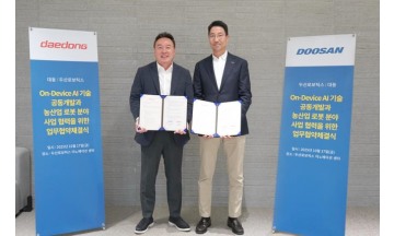 두산로보틱스는 농기계 전문 기업 대동과 손잡고 농업용 로봇 분야 신사업을 발굴한다고 20일 밝혔다. 양사는 지난 17일 경기 성남시 분당구 두산로보틱스 이노베이션센터에서 '온디바이스 인공지능(AI) 기술 공동 개발 및 농산업 로봇 분야 사업 협력을 위한 업무협약(MOU)'을 체결했다.두산로보틱스와 대동은 스마트팜·실외에 최적화된 농업 로봇을 공동 개발하고 비정형 농업 환경에 적용 가능한 온디바이스 AI를 개발, 상용화한다. 또 이 분야 글로벌 시장 개척에 힘을 모은다.두산로보틱스는 농업에 특화된 이동형 로봇을 제품화하기 위해 로봇 팔과 제어 시스템을 설계·제조하고 로봇 팔 동작 개발을 맡는다. 대동은 다양한 농업 현장 데