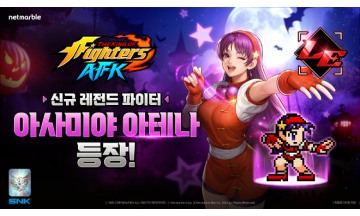 넷마블(대표 김병규)이 16일 '킹 오브 파이터 AFK'에 신규 파이터 '아사미야 아테나'가 등장한다고 밝혔다.아사미야 아테나는 정의로운 여고생 아이돌이자 세계 평화를 위해 싸우는 파이터다. 사이코 파워와 전통 권법을 활용한 독특한 전투 방식이 특징이며 예의 바르고 성실한 성격에 상반된 매력으로 팬들에게 인기가 많다. 이용자들은 오는 29일까지 진행되는 픽업 이벤트에서 아사미야 아테나를 소환할 수 있다. 같은 기간 '인내' 시너지 파이터 소환 이벤트도 함께 진행된다.이밖에도, 11월 5일까지 출석 이벤트 '스푸키 나이트'가 열린다. 게임에 접속만 해도 시즌 특별 잭-오-랜턴 프로필, 연료, 루비와 같은 필수 성장 재화를 획득할 수