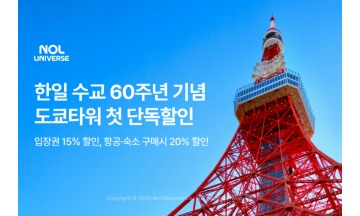 놀유니버스(대표 배보찬·최휘영)가 한일 수교 60주년을 기념해 일본 도쿄의 명물 도쿄타워와 함께 단독 프로모션을 진행한다고 12일 밝혔다. 놀유니버스가 운영하는 NOL 인터파크투어에서는 오는 30일까지, NOL에서는 내달 1일부터 31일까지 도쿄타워 입장권 상시 15% 할인 혜택을 제공한다. 또 항공·숙소 구매자에게는 추가 5%의 할인 혜택도 있다. 도쿄타워 상품 구매자 가운데 리뷰를 작성한 고객 가운데 총 200명에게는 커피 기프티콘도 증정한다. 이번 도쿄타워 할인 특별 프로모션은 국내에서 진행되는 첫 단독 할인 행사로, NOL 인터파크투어와 NOL에서만 혜택을 받을 수 있다. 또 오사카의 유명 관광 코스로 자리잡은 유니버셜 스튜디