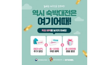 인터파크투어가 ‘ESG와 함께하는 2022 대한민국 숙박대전’을 오픈했다. 대한민국 숙박대전은 문화체육관광부와 한국관광공사가 주관하는 국내여행 소비진작 프로모션으로, 7만원 이하 숙박 시 2만원 및 7만원 초과 숙박 시 3만원 국내숙박 할인쿠폰을 발급해준다. 인터파크투어는 이번 프로모션을 통해 오늘부터 오는 5월 8일까지 매일 오전 10시부터 선착순으로 할인쿠폰을 발급해주며, 숙박 가능 기간은 오늘부터 오는 6월 6일까지다. 아울러 인터파크투어 단독 혜택으로 총 2천만원 이상 규모의 중복 할인쿠폰과 경품을 마련했다. 카드 및 간편결제 이용 시 최대 5만원 중복할인 혜택을 제공한다. 아울러 숙박대전 참여 고객을 대상으로 추첨
