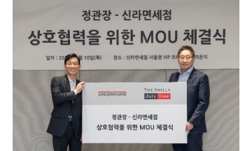신라면세점이 KGC인삼공사의 '정관장' 브랜드와 전략적 업무협약(MOU)을 체결하고 건강기능식품 시장에서의 경쟁력 강화를 위한 협력에 나선다.신라면세점은 지난 10일 서울시 중구 장충동에 위치한 신라면세점 서울점에서 김준환 호텔신라 TR부문장과 한승규 KGC인삼공사 마케팅본부장 등이 참석한 가운데 신라면세점과 정관장의 상호협력을 위한 MOU 체결식을 진행했다고 14일 밝혔다.이번 협약을 통해 양사는 △신규 상품 공동 기획 및 출시 △내·외국인 대상 맞춤형 마케팅 및 이벤트 활동 전개 △해외 신규 채널 개발 등을 추진하기로 했다.신라면세점은 정관장과의 협업을 통해 글로벌 건강식품 시장에서의 입지를 더욱 공고히 하고, 차별